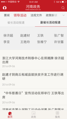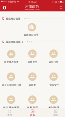 河南政务客户端现开通要闻、河南、领导活动、部门、地方、民生保障、法规文件、政策解读、公告公示、图片新闻等栏目,第一时间权威发布河南省政府重大决策部署和重要政策文件、河南省政府领导同志重要会议、考察、出访活动等政务信息,同时面向社会提供与政府业务相关的服务,建设基于新媒体的政府与公众互动交流新渠道。