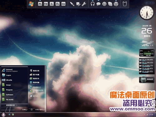 魔法桌面原创xp仿windows7桌面主题——奇幻云朵。非主流的色彩加上晶莹剔透的质感,就是奇幻云朵主题的最大特色,虚幻缥缈的云朵让人感觉空旷而悠远。本主题包含三种字体版本,默认是宋体版,您可以在“外观”-“字体大小”处切换至其他字体版本。此主题还附带精美的奇幻云朵仿windows7登陆界面哦