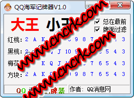 QQ海军记牌器 V1.0 简体中文绿色免费版 qq海军记牌器是一款支持所有qq斗地主游戏的绿色记牌器 ,全自动记牌、自动分析剩余牌和炸弹牌, 当有一家明牌的时候,自动分析并显示另一家的全部牌,让你一目了然,知己知彼,百战百胜,记牌器同时支持:欢乐斗地主、视频欢乐斗地主、角色版斗地主,进入游戏后,软件自动记牌,无需手工操作,界面简洁,功能强大