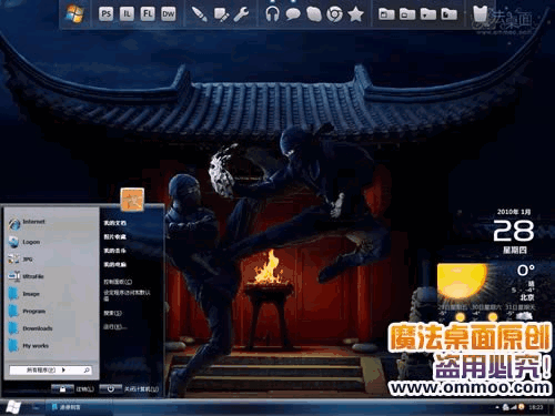 魔法桌面原创xp仿windows7桌面主题——浪漫刺客,主题的开始菜单和窗口都使用了直角模式,并且采用仿windows7的宽任务栏以及底边栏样式,美观、新颖。为了获得最佳显示效果,请将桌面图标大小调整为32×32。本主题包含两种字体版本,默认是宋体版,您可以在“外观”-“字体大小”处切换至微软雅黑版。此主题还附带精美的仿windows7登陆界面哦