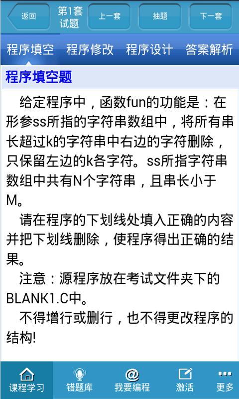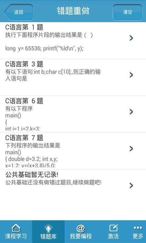 全国计算机二级C语言掌上通、完全离线的,零流量的二级C语言学习软件。 包含C语言教程(培训机构内部经典教程),C语言选择题题库,公共基础题库,非选择题题库。教程和题库实现了考点和重点全覆盖。