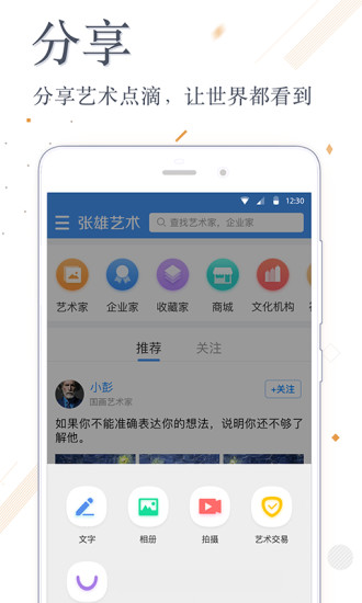 张雄艺术,为您提供名家官网、视频访谈、展览、艺术宣传、搭建圈子资源等服务,研发各种艺术作品分享宣传工具,支持身份认证、艺术直播、语音听展、相册制作、3D展馆等,旨在为艺术工作者提供更好的服务!【软件功能】