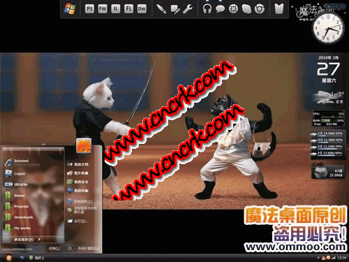 魔法桌面原创xp仿vista桌面主题——猫武士。主题壁纸是两只小猫在比武,神情惟妙惟肖,十分的可爱。本主题包含三种字体版本,默认是宋体版,您可以在“外观”-“字体大小”处切换至微软雅黑版或是arial字体版。此主题还附带精美的猫武士仿vista登陆界面哦