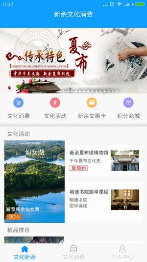 新余文化消费APP是国家文化消费试点城市(新余)的线上公共平台,开辟文化活动、文化娱乐、文化旅游、文化产品、文化教育、文化场馆、积分商城七大版块。