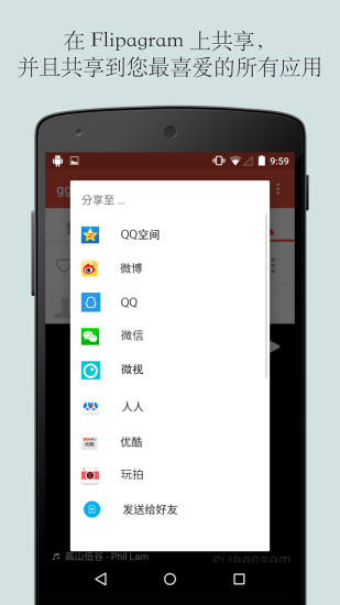 3. 分享 - 在 Flipagram 上分享,或者在QQ空间,QQ, 微信,微视 ,等 上分享。