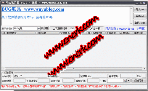 网站记录器可以记录的项目有“网站地址”、“网站标题”、“帐号”、“密码”、“PR值”、“百度收录”、“谷歌收录”、“百度反链”和“雅虎反链”等。初衷是用于给seoer记录做外链网站用的,当然,也可以用来记录其它东西。
