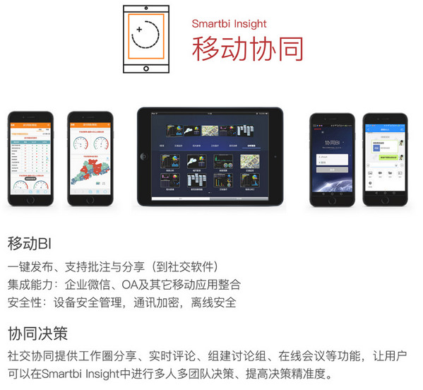 Mobile移动应用让企业员工可以随时随地地通过手机、平板查看和分析数据。丰富的图形让数据展现栩栩如生,离线下载随身携带数据,手写批注让信息分享、决策讨论更加轻松。