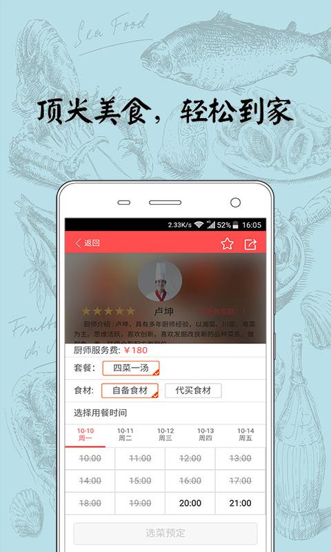 【厨师上门】随时随地约星级厨师上门服务,开启新的约饭方式,在家就能轻松享受星级美食和服务,厨师上门服务目前开通厦门城市。【私人定制】吃得健康吃得上档次又美味,用私人定制,高端筵席吃出好品质。