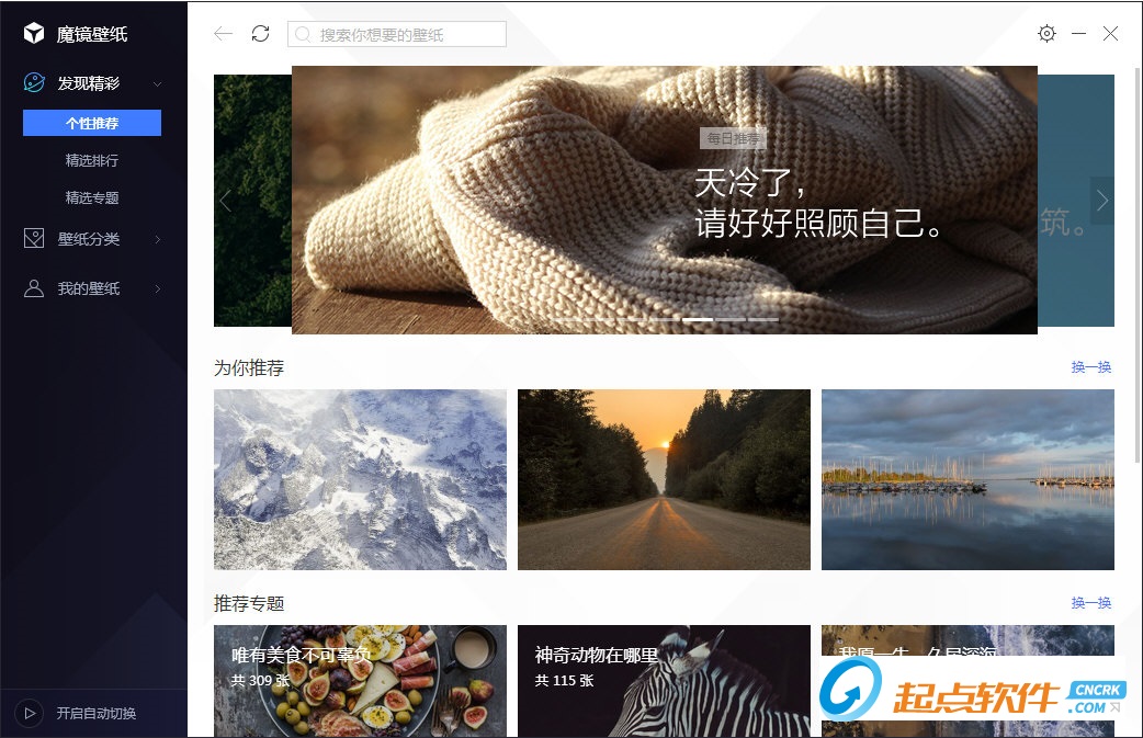 腾讯电脑管家全新升级的“桌面整理-魔镜壁纸”设置了“发现精彩”、“壁纸分类”、“我的壁纸”三大栏目,可根据用户喜好,为用户智能推荐想要的桌面壁纸。用户还可以在主界面中“搜索栏”、“为你推荐”、“推荐专题”中轻松查找想要的壁纸。