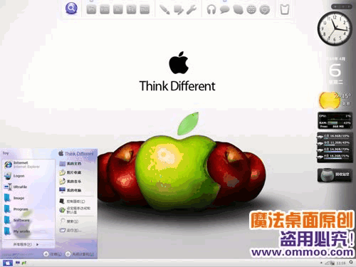 魔法桌面原创xp仿vista桌面主题——思而不同。主题用炫彩的苹果图片做开始菜单,配合亮灰色的任务栏,为你带来细腻且具有磨砂效果的质感主题。主题包含三种字体版本,默认是宋体版,您可以在“外观”-“字体大小”处切换至微软雅黑版或是arial字体版。此主题还附带精美的思而不同仿mac登陆界面哦
