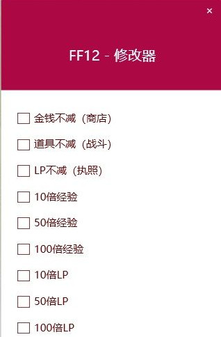 最终幻想12黄道时代五项修改器,由qass制作,具备金钱不减少,战斗时道具不减少,LP不减少,超高倍数经验及LP等五项修改器功能,需要的朋友可自取。【软件特点】