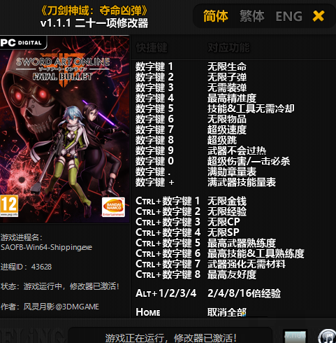 刀剑神域夺命凶弹修改器是一款免费绿色的游戏修改工具。该工具不仅小巧绿色,还可以为玩家免费提供二十一项强大的游戏修改功能,有需要的玩家自行下载。
