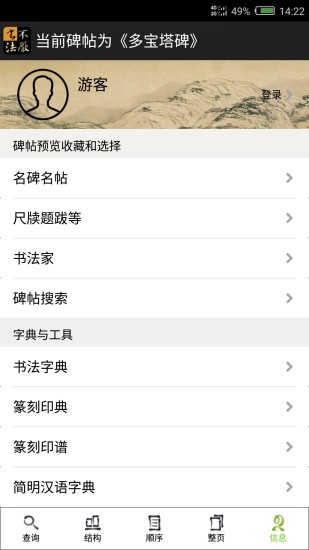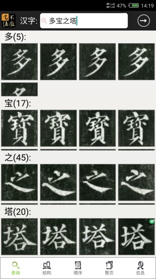 17,工具页提供“书法字典”功能,书法字典可控制朝代、字体范围,查询结果以碑帖为单元,点击进入单字页,罗列改碑帖同一个字的所有写法;
