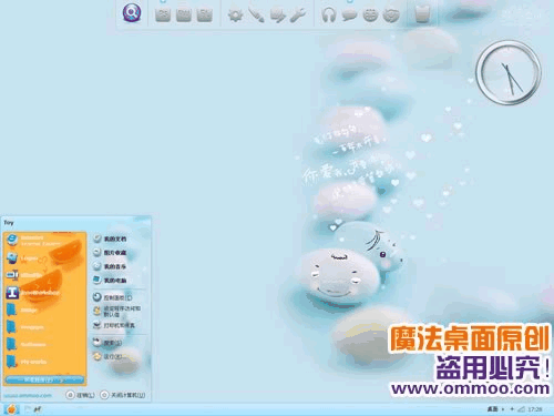 魔法桌面原创xp仿mac桌面主题——趣味静物摄影之爱情。用可爱系的非主流爱情图片做壁纸,淡蓝色的界面就像纯纯的恋爱感觉般让人舒心。主题包含三种字体版本,默认是宋体版,您可以在“外观”-“字体大小”处切换至微软雅黑版或是arial字体版。此主题还附带精美的仿mac登陆界面哦