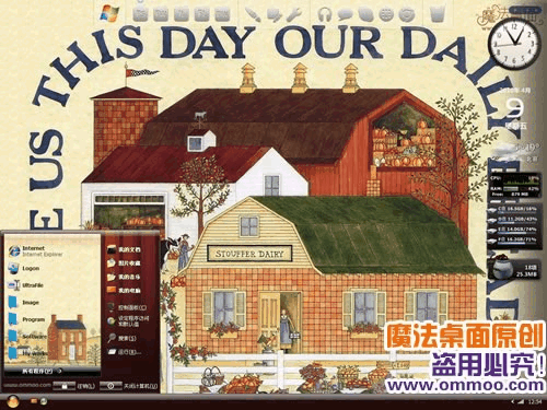 魔法桌面原创xp仿vista桌面主题——十八世纪手绘英国—农庄丰收了。本主题包含三种字体版本,默认是宋体版,您可以在“外观”-“字体大小”处切换至微软雅黑版或是arial字体版。此主题还附带精美的仿vista登陆界面哦