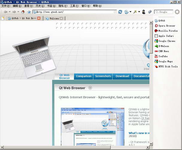 QtWeb V3.7.3 多国语言绿色免费版 qtweb浏览器是一种快速、安全、具有一些独特的用户界面和隐私功能的网络浏览器。 qtweb是免费的,非商业和基于开源项目qt开发框架和webkit渲染引擎的(用于safari和chrome)的网络浏览器。可自定义用户界面:更改界面风格,看看在windows和unix环境的不同版本下的外观,自定义网络搜索提供商,菜单标题,分配热键和快捷键,标签式界面