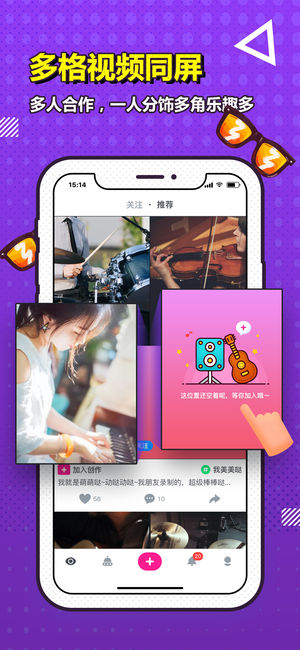 在这里可以自己独立创作有趣的音乐短视频,也可以邀请小伙伴进行多格视频玩法的内容创作,更可以与明星歌手对飙,发挥你无处安放的创造力,青春躁起来!
