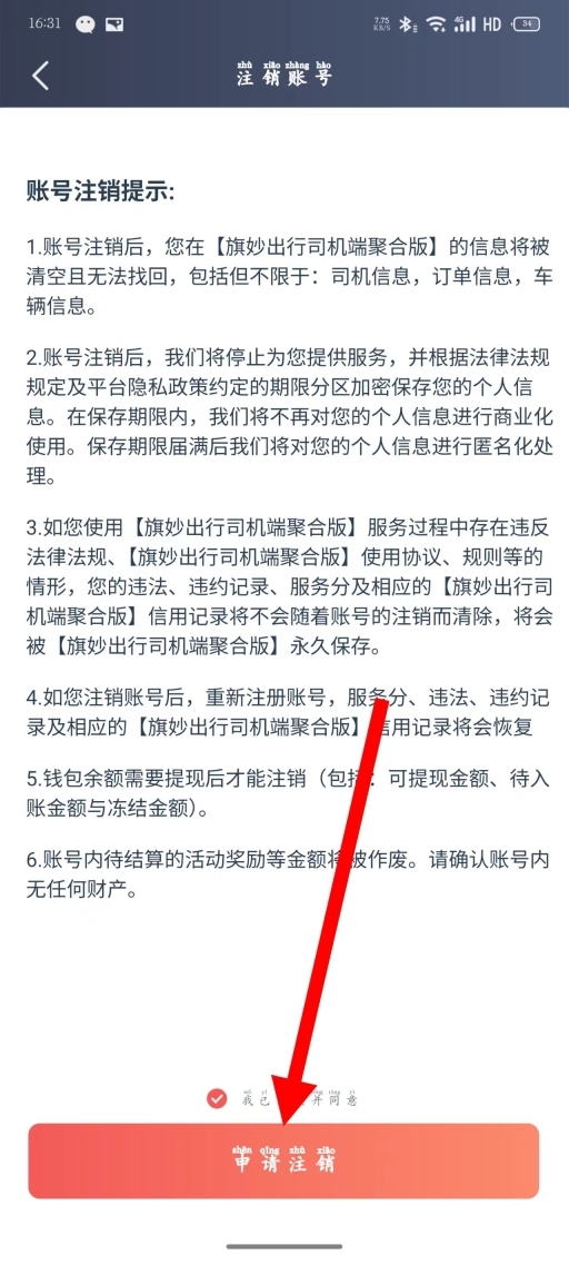 5、仔细阅读账号注销提示,勾选同意相关条款,随后点击“申请注销”,并依照提示完成后续操作。