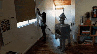从图中可以看到,打开窗户和关灯时机器人和狮子身上的光影也随之改变,像是真的有光打在它们身上。更有趣的是,这些虚拟动物还能够对环境光的改变产生惊吓等反应。