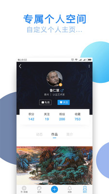 v1.2.18包含艺术圈、作品、动态,聊天通讯,个人中心相关信息,能够发布动态和作品,并新增加文旅版块