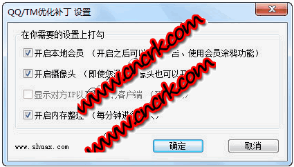 QQ/TM优化补丁 V1.1 简体中文绿色免费版 qq/tm优化补丁由s大shuax制作!采用msimg32.dll加载,无需更改qq任何文件即可实现本地会员、开启摄像头和内存整理。默认全部选项开启,按下ctrl+alt+f2快捷键后可以弹出配置界面。很期待shuax尽快开发出强大的显ip功能