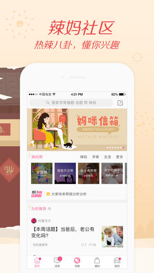 【个性化定制】基于大数据,真正实现“千人千面”个性化的内容呈现,每位用户看到的都将是独一无二的个性化、人性化页面,让您玩转辣妈帮;【我的帮】用户加入各种感兴趣的帮,妈妈情感交流帮、两性健康帮、专家孕育问答、宝宝教育帮、备孕、怀孕、坐月子等辣妈帮,让妈妈每天有聊不完的话题;