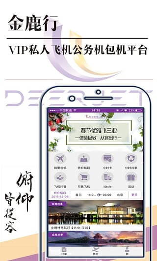 金鹿行APP是金鹿公务将20余年的服务经验与互联网科技相融合,开发的一款面向中高端用户的全新的公务航空APP,它结合了金鹿公务自身运营优势及互联网+理念,不仅拥有国内领先的即时报价系统、全面丰富的产品类型(包机、调机、托管、小时卡等),更有强大的优惠积分活动,为中国公务航空业的发展注入了新的动力。颠覆:打破公务机传统商业模式