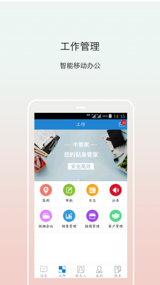 1、企业内部管理模块 包括考勤签到、工作审批、员工日志、公司公告、视频会议、销售管理、招商管理、客户管理功能,为企业创建高效的移动办公管理平台,满足各类办公需求,实现企业精细化管理,提高企业工作效率,提升企业执行力。2、居家养老服务模块包括好菜、好品、家政服务、网上就医、在线缴费、自媒体功能,实现网上下单,足不出户生鲜配送到家,网上缴纳话费、水、电、煤气费,线上线下交易同步化。
