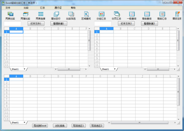 Excel超级比较汇总是一款功能强大的Excel工具软件,它提供了全面有效且简便安全的工作表比较、全文档比较、文档连接、添加空行、比较筛选、区域查找、分组汇总、分页汇总、一般查询、高级查询、高级汇总,十一个功能模块。使用Excel超级比较汇总,能够有效地帮助用户快速文档比较和数据汇总,来缩短您的工作时间和提高您的工作效率,使您不必在为烦琐的手工比较汇总而苦恼,请把最累人的工作交给Excel超级比较汇总来做吧,它将是您最好的工作助手。Excel超级比较汇总是个独立运行的程序,Excel超级比较汇总同时适用于WindowsXP/2003/Vista/7/8/10操作系统平台,对64位系统具有极佳的兼容性与完善的功能支持。后台程序需要Excel2003或Excel更高版本支持,Excel超级比较汇总在一个界面完成所有的比较或汇总工作,不需要来回切换Excel程序。