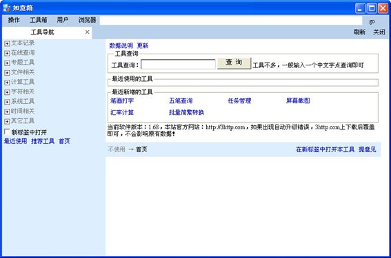 如意工具箱 整合各种小工具的一个绿色免费软件,需要.net2.0框架,在windows vista和windows 7上能直接运行。
