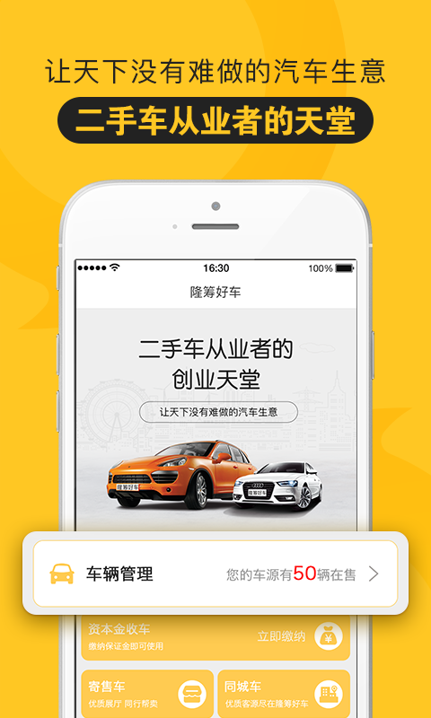 “隆筹好车”作为一家专业、高效的二手车电商+展厅连锁平台,现结合线下业务打造隆筹好车_经纪人APP——服务经纪人的交易工具,使经纪人轻松买车卖车。【软件特点】