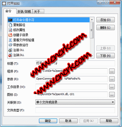 打开加加 V1.5 简体中文绿色免费版 打开加加是一个上下文菜单外壳扩展,它支持使用预先定义的命令快速打开资源管理器中所选中的文件和文件夹。当在资源管理器中右键点击一个文件或文件夹图标、或右键点击一个文件夹背景时,打开加加将在外壳上下文菜单中添加一个自定义菜单项的子菜单。打开加加子菜单类似于标准的“发送到”菜单,但是打开加加更强大,因为打开加加允许你为所有添加到外壳上下文菜单中的命令定制菜单项的标题、程序、参数、工作目录、图标、关联的文件类型。