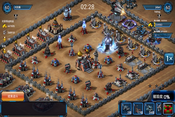 这是一款科幻风格的战略游戏,在这里玩家真正能体验打造一个超酷的军事帝国,率领自己的部队兵临城下,肆意摧毁敌人老巢,并和他人联手对抗敌方集团军的乐趣。游戏支持多达35人的军团战,也能拉开架势,展开敌我双方大规模又奢华的兵器消耗战。详细玩法是为建筑、战斗。通过收集、消耗资源建造升级建筑,从而组建作战单位,参与战斗。战斗包含PVE和PVP玩法,PVE进入副本刷关卡,通过战斗掠夺资源,战斗方式采用投放兵力自动进攻。PVP包含竞技场玩法,匹配对手进行1v1对战,刷天梯排行。也有军团战这种进行多人组队PK玩法。除此之外还有世界BOSS玩法,通过伤害排名获得奖励。