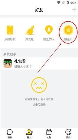 3、完成登录后,先后点击“好友”,再点击“赚金币”。