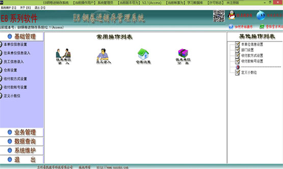 e8钢卷进销存管理软件是针对钢卷进、销、存管理于一体的软件,特别为从事钢卷经营的企业设计,它的功能范围包括进货管理、销货管理、运费管理、加工管理、调拨管理、应收应付款的管理、库存管理,并有功能完整、全面的经营报告系统。安装后马上可以开始使用,是一款即装即用的软件。由于钢卷经营的特殊性,本软件恰恰就是针对了行业特点,具有多仓库存管,各仓库之间自由调拨功能,同时兼顾物流管理,轻松管理运费问题;可置后的价格管理功能及发((票))管理功能,解决经营中的诸多特殊问题;按收付款方式及收付款帐号自动汇总,轻松管理资金存管。只要录入各类单据,其他各类统计表、汇总表、明细表表均会自动生成,省时省力。网络版除了可局域网中连接操作外,独特的通过普通宽带(如ADSL)连接远程数据库,轻松实现广域网(互联网)上数据共享操作,为用户节省巨大宽带租用费用。【功能特色】