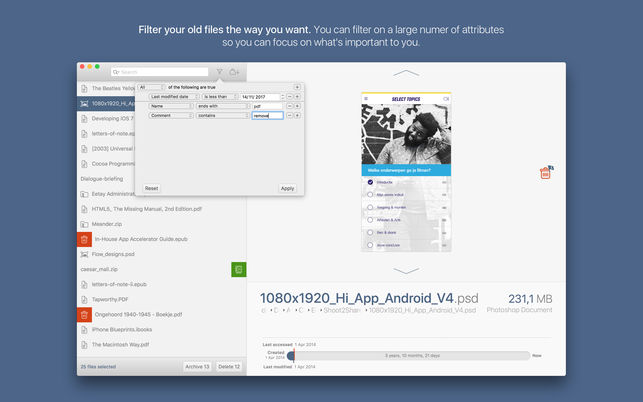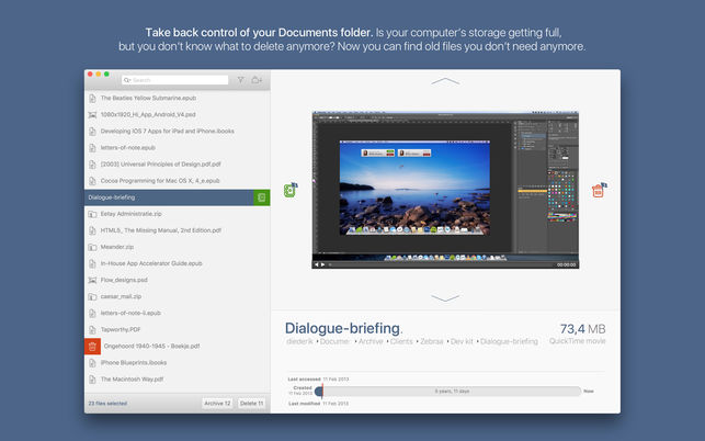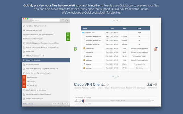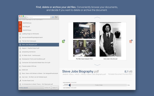 你的电脑的存储已经满了,但你不知道该删除什么?现在你可以使用Fossils Mac版来找到你不再需要的旧文件了。查找、删除或归档旧文件。方便地浏览您的文档,并决定是否要删除或归档文档。快速预览你的文件,然后删除或归档。