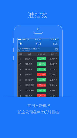 准指数:准点趋势、准点排名、准点对比航空公司、机场、航线、空管多维度分析。