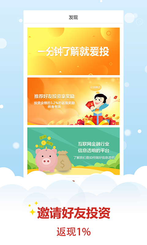 新手理财专享:注册即邀请好友投资,即可获得好友投资的1%的现金奖励稳健理财:起投100元