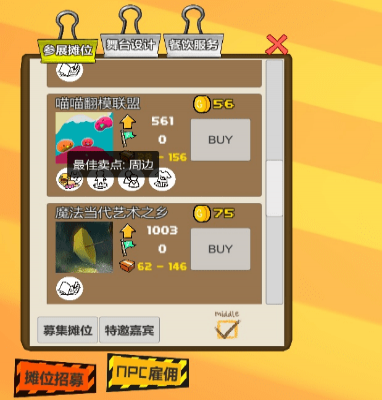 ★招聘不同职能的展位(普通摊位、特色舞台、餐饮服务)与NPC(官方Coser、引导员、保安、清洁工),自由摆放★游戏安装目录下自定义Cosplayer、摊位的美术和属性