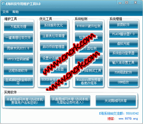 维护工具有:万能批处理,一键清理垃圾文件,雨林木风diy1.6,office密码,远程协助软件,生成新的安全标识符。