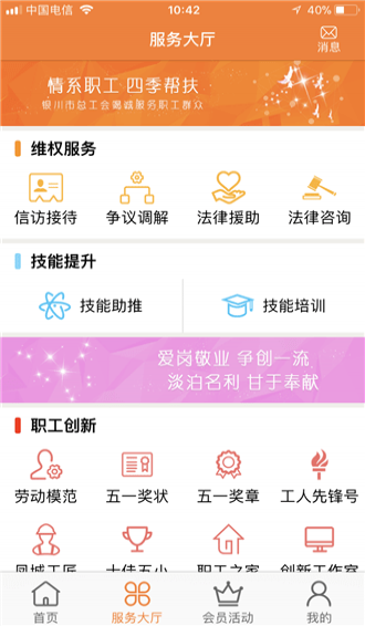 银川工会APP作为银川市工会日常事务的统一移动入口,具有个人入会、单位建会、练兵答题、在线投票、工会简介、在线咨询、通知公告、工作动态、服务信息、维权服务、信访接待、争议调解、法律援助、法律咨询、技能助推、技能培训、劳动模范、五一劳动奖章、五一劳动奖章、工人先锋号、凤城工匠、职工之家、创新工作室、困难帮扶、医疗互助、职介服务、文化阵地、电子书屋、生活服务、普惠活动、 抽奖活动、读书演讲、文艺汇演、体育竞赛、职工书画、职工摄影、问卷调查、个人设置等多项服务于广大职工的功能,是沟通广大职工与银川总工会的桥梁。【软件特色】
