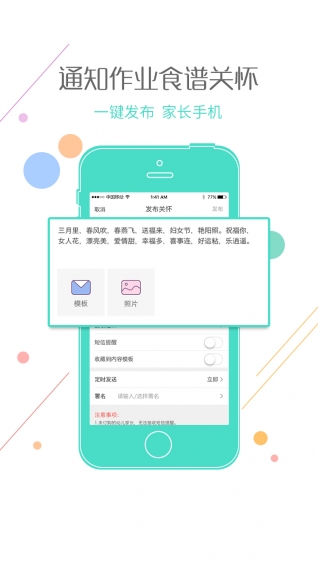 1)家园互动 — 短信发送、IM及时聊天,随时随地架起教师、家长的沟通桥梁,让家园沟通无处不在。2)口碑宣传 — 便捷的园所微网站轻松搞定,可以展示,可以招生,提升幼儿园口碑。