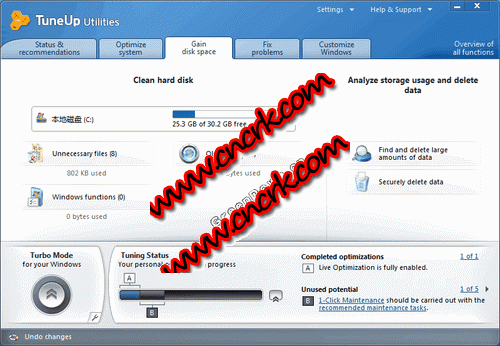 TuneUp Utilities 2011 英文绿色便携版 TuneUp Utilities是来自德国的系统调整工具,它能够让你的系统跑的更顺畅。tuneup utilities的功能应有尽有,主要工具包括:系统改造/分析、硬盘/登录文件清理、系统加速、记忆体最佳化、登录文件编辑、软件卸载、工作管理员、文件还原/清理!