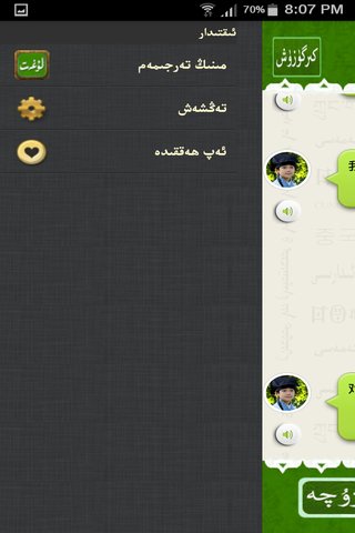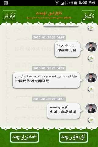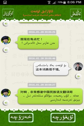 有识别语音功能的维汉语音翻译词典。此app是由《中国民族语文翻译局》发布的。(此版本是个体为了兴趣而翻译维文和美化画面的)维汉语音翻译app实现了维吾尔语、汉语两种语言语音输入、两种语言的语音朗读,并实现两种语言的翻译功能,为不会说汉语的维吾尔族民众,与不会讲维吾尔语的汉族大众之间的交流架起一座沟通交流的桥梁。