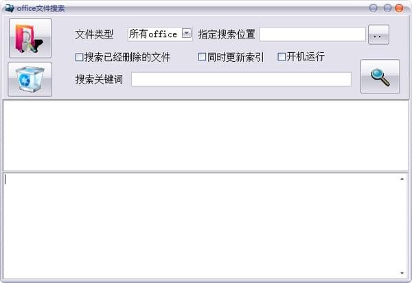1、打开软件,选择文件类型、指定搜索位置、是否搜索已经删除的文件/同时更新索引/开机运行、还得输入搜索关键词。