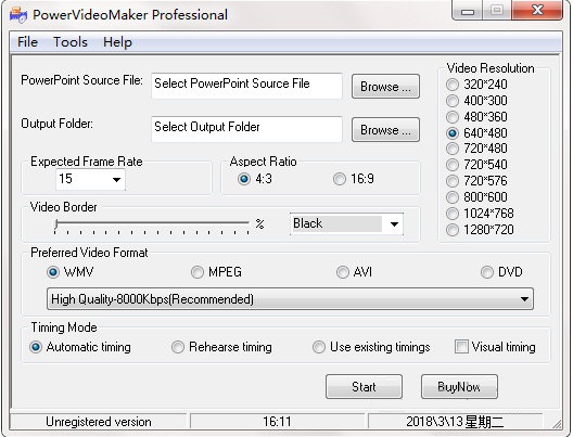 5、Start 开始转换,选择不同的 Timing Mode 转换的步骤也不一样。如选择 Rehearse Timing Now 会先调用PowerPoint的排练计时功能让你进行设置,然后进行预转换、屏幕捕捉、视频转换、合并wmv文件等步骤,最后生成WMV及AVI文件。