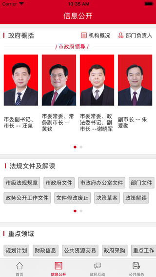 1.信息公开:政务公开、规划计划、政策文件、新闻动态。2.网上办事:我的办事、在线办事、进度查询、办事热点