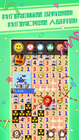 游戏同时保留了单机扫雷高级模式99雷的经典玩法,作为PVP据点存在,所有人都可以通过挑战据点来争夺它,谁能最快的通过就能占领据点,成为据点之主等待其他玩家的挑战!