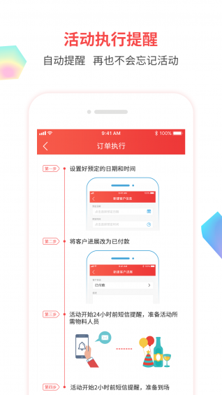 客户跟进:记录客户信息,掌握跟进状态,客户状态一目了然,不再有漏单活动执行:提前准备,提前出发,有人提醒真好