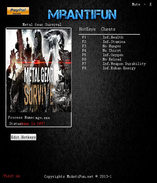合金装备:幸存 v1.04八项修改器,由“MrAntiFun”制作,具备无限生命,无限耐力,不会饥饿与口渴,无限氧气,无需再装填,无限武器耐久等八项修改器功能,本站提供合金装备:幸存修改器,需要的玩家不要错过哦!【功能详情】